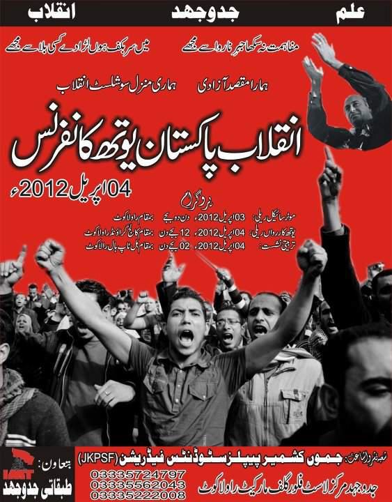 جے کے پی ایس ایف کے زیر اہتمام انقلاب پاکستان یوتھ کانفرنس کا انعقاد، سرمایہ داری نظام کیخلاف بغاوت کی ایک نئی چنگاری کو بھڑکانے کے مترادف ہے۔ چار اپریل 2012ء کو راولاکوٹ کے مقام پر آل پاکستان پراگریسو یوتھ الائنس کے تعاون سے جے کے پی ایس ایف کے زیر اہتمام آل پاکستان یوتھ کانفرنس کا انعقاد کیا گیا جس میں جے کے پی ایس ایف ، جے کے این ایس ایف، انقلابی کونسل فیصل آباد، پی ایس ایف پنجاب، اور بی این ٹی کے سینکڑوں نوجوانوں نے شرکت کی۔ یہ اپنی نوعیت کاایک منفرد واقعہ اس حوالے سے ہے کہ پاکستان اور آزادکشمیر میں پیپلزپارٹی کی حکومتیں قائم ہیں اور پی ایس ایف اور پیپلز یوتھ سے وابستہ زیادہ تر نوجوان نوکریوں اور ایڈجسٹمنٹوں کی امید لئے وزرا اور حکومتی اہلکاروں کے دفاتر کے چکر لگا رہے ہیں۔ پارٹی کی تمام تنظیموں سے وابستہ کوئی بھی کارکن کسی بھی ایسی سیاسی سرگرمی میں حصہ لینے سے گریزاں ہے جس سرگرمی میں کسی سماجی یا معاشی ایشو پر بحث کا خدشہ موجود ہو کیونکہ وہ کارکنان وزرا اور پارٹی قیادت کو ناراض کرنے سے ڈرتے ہیں۔ ایسی کیفیت میں جب آئی ایم ٹی سے وابستہ پی ایس ایف کے چند نوجوانوں نے بھٹو کی برسی کے موقع پر انقلاب پاکستان کانفرنس کے انعقاد کا اعلان کیا تو پارٹی کے زیادہ تر کارکنان حیرت زدہ ہو گئے۔ پارٹی قیادت کی چاپلوسی کرنے والوں نے اس کانفرنس کو سبوتاژ کرنے کے لئے نہ صرف ان کامریڈز کو پارٹی سے نکالنے کے شوکاز نوٹس جاری کئے بلکہ ذرائع ابلاغ میں ایک بے ہودہ الزام تراشیوں کی مہم بھی شروع کر دی۔ لیکن انقلاب پاکستان کانفرنس کی تیاریوں میں جب کوئی کمی نہ آئی تو اسی کانفرنس کی سیاسی اہمیت کو کم تر کرنے کیلئے اسی دن راولاکوٹ میں ایک سرکاری تقریب کا انعقاد کروایا گیا جس میں مہمان خصوصی کے طور پر وزیر سماجی بہبود آزادکشمیر فرزانہ یعقوب کو بلا کر نوجوانوں کو اس کانفرنس سے دور کرنے کا آخری حربہ آزمایا گیا۔ لیکن پی ایس ایف کے کامریڈ کی طلبہ اور نوجوانوں کے بنیادی ایشوز پر ایک پرجوش مہم نے انقلاب پاکستان کانفرنس کو نئے جوش و خروش سے بھر دیا۔ چار سو سے زائد نوجوانوں پر مشتمل ریلی پوسٹ گریجویٹ کالج سے شروع ہو کر شہر کا چکر لگاتی ہوئی ہل ٹاپ ہال میں پہنچی ، کانفرنس کا آغاز مزدوروں کے ترانے انٹرنیشنل کی ریکارڈنگ کے ساتھ کیا گیا ۔ اس کے بعد برطانیہ کی کیمبرج یونیورسٹی میں یونین کے انتخابات جیتنے والے کامریڈ ارسلان غنی کا آڈیوپیغام حاضرین کو سنایا گیا۔ کانفرنس کی صدارت پی ایس ایف کے مرکزی چیئرمین پبلی سٹی بورڈ کامریڈ ثاقب فاروق نے کی جبکہ مہمان خصوصی پراگریسو یوتھ الائنس کے مرکزی آرگنائزر کامریڈ امجد شاہسوار تھے۔ سٹیج سیکرٹری کے فرائض کامریڈ عاصم غزن نے سرانجام دیئے۔ کانفرنس میں پی ایس ایف کے مقامی نوجوانوں کی بڑے پیمانے پر شرکت نے سرکاری تقریب کی مہمان خصوصی وزیر سماجی بہبود فرزانہ یعقوب کو وہ سرکاری تقریب ختم کر کے انقلاب پاکستان کانفرنس میں یکجہتی کیلئے مجبوراً آنا پڑا۔