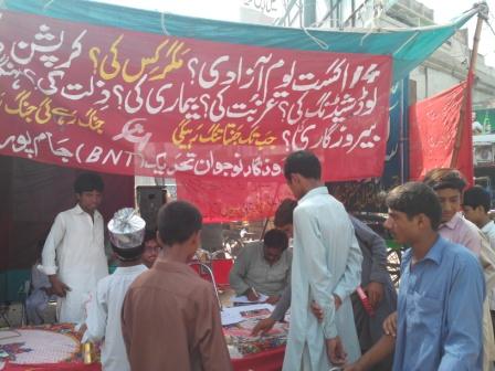 14 اگست کو جہاں حکمران طبقات نام نہاد آزادی کا جشن منا رہے تھے وہاں ملک بھرکی طرح جامپور میں بھی بے روزگار نوجوان تحریک (BNT) کے زیر اہتمام بے روزگاری، بھوک، غربت، لا علاجی، لوڈشیڈنگ، دہشت گردی اورمہنگائی کے خلاف شہر کے وسط، ٹریفک چوک جامپور میں ایک احتجاجی کیمپ لگایا گیا۔ کیمپ کا آغاز صبح 8:00 بجے کامریڈ روف لنڈکی قیادت میں کیا گیا۔ کیمپ کو منظم کرنے میں BNT جامپور کے کامریڈ طیب، حاتم، سچل، عقیل، غضنفر، ظفر اور عرفان پتافی نے سرگرم کردار ادا کیا۔ کیمپ کو بینرز سے آویزاں کیا گیا تھا جن پر ’’جب تک جنتا بھوکی ہے، یہ آزاد ی جھوٹی ہے‘‘ اور ’’جب تک جنتا تنگ رہے گی، جنگ رہے گی جنگ رہے گی‘‘ کے نعرے درج تھے۔ جامپور شہر اور دیگر علاقوں سے آنے والے طلبہ اور نوجوان بڑی تعداد میں کیمپ پر جمع ہوئے سیاسی بحث ومباحثے تمام دن جاری رہے۔ BNT کی طرف سے ایک لیف لیٹ بھی تقسیم کیا گیا جس میں عوام کے حقیقی مسائل اور ان کی وجوہات بیان کرتے ہوئے محنت کشوں اور نوجوانوں سے سرمایہ دارانہ نظام کے خلاف طبقاتی بنیادوں پر یکجا ہونے کی اپیل کی گئی۔ اس موقع پر سو کے قریب نوجوانوں نے BNT میں اپنا نام رجسٹر کروایا۔ کیمپ شام پانچ بجے تک جاری رہا۔