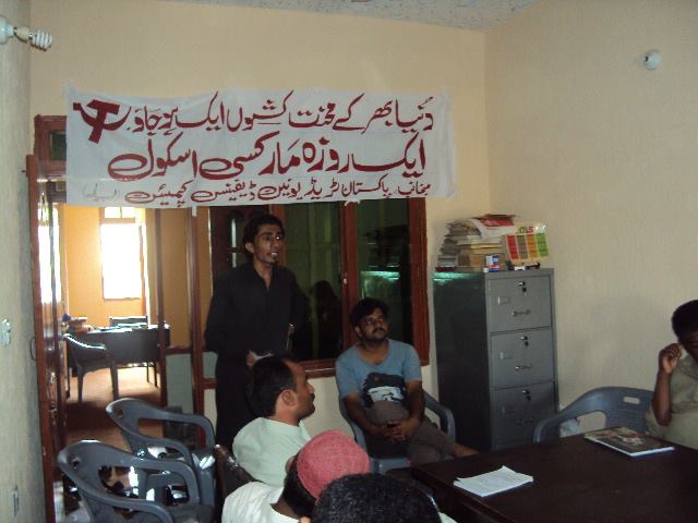 دی گئی تھی۔1848ء میں مارکس نے محنت کشوں کی پہلی انٹر نیشنل کی بنیاد رکھی اور کمیونسٹ مینی فیسٹو لکھ کر ٹریڈ یونین قیادت سمیت تمام محنت کشوں کو ان کی منزل اور راست کی نشاندہی کر دی جس کے بعد ٹریڈ یونین کا کردار یکسر بدل گیا۔ اسی طرح اس کے بعد خاص کر پہلی عالمی جنگ کی کوکھ سے جنم لینے والی کیفیت نے 1917ء کے عظیم بالشویک انقلاب کی راہ ہموار کی اور اس انقلاب نے مارکسی نظریات کو عملی جامہ پہنا دیا تھا جس کے بعد پوری دنیا کی طرح ہندوستان میں بھی محنت کشوں نے اپنے تاریخی کردار کی طرف قدم بڑھاتے ہوئے کمیونسٹ پارٹی کی بنیاد رکھی۔ حالانکہ اس سے قبل 1886ء میں جہازیوں کی ہڑتال سمیت محنت کشوں کی جدوجہد سے بھرپور روایات موجود تھیں لیکن 1946ء میں بننے والی کمیو نسٹ پارٹی ایک اہم قدم تھا ۔ بالشویک انقلاب پر اسٹالن کے قبضے کے بعد ایک مضبوط حکمت عملی کی عدم موجودگی کی وجہ سے اس پارٹی میں انقلاب کرنے کی اہلیت پیدا نہ ہو سکی۔ سوویت یونین کے انہدام کے بعد عالمی سطح پر محنت کشوں کو سرمایہ داروں کے شدید حملے برداشت کرنا پڑے تھے ۔ لیکن یہ کیفیت ہمیشہ قائم رہنے والی نہیں ہے اس کیفیت نے ٹوٹنا شروع کر دیا ہے جسے یونان میں بخوبی دیکھا جا سکتا ہے ۔ اسی طرح بھارت میں 15 کروڑمحنت کشوں کی عام ہڑتال نے پوری دنیا پر محنت کشوں کی اہمیت ثابت کر دی ہے۔آج پھر تاریخ کا دھارہ بدل رہا ہے ہمیں پورا یقین ہے کہ ایک بار پھر سے محنت کش طبقہ اپنی صفوں سے اپنی قیادت تراشتے ہوئے تاریخ کے دھارے کو ایک نیا رخ دیتے ہوئے اس دنیا پر عظیم محنت کشوں کی حکمرانی قائم کرے گا ۔لیڈ آف کے بعد سوالات کا سلسلہ چلا اور پارس جان نے اس سیشن کا با قاعدہ سم اپ کیا ۔