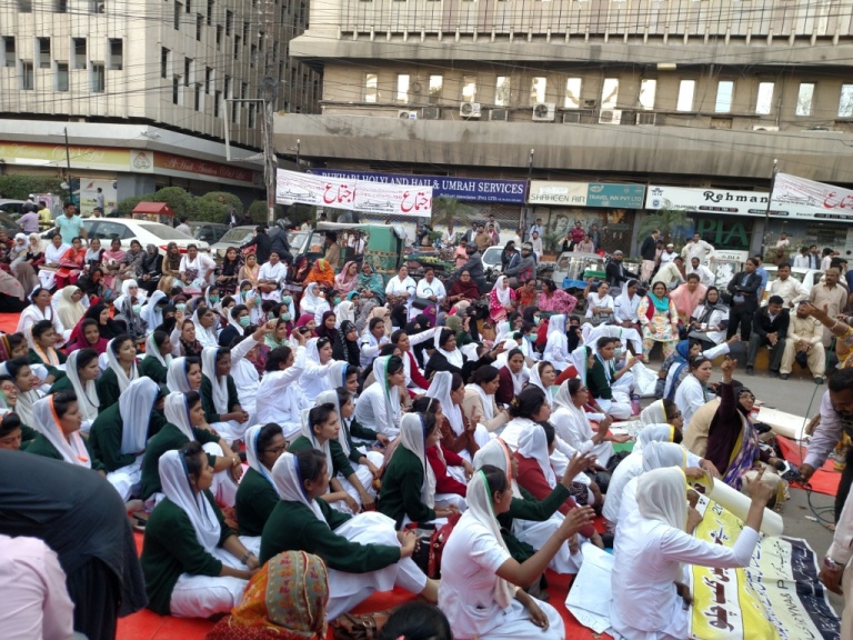 اس سے قبل سندھ نرسنگ ایسوسی ایشن کے تحت کراچی سمیت صوبے بھر کے سرکاری ہسپتالوں کی نرسز نے جمعرات کو تیسرے روز بھی اپنے مطالبات کیلئے احتجاجی مظاہرہ کیا، دھرنا دیا اور بینرز اور پلے کارڈز کے ساتھ مطالبات کے حق میں نعرے بازی کی۔ اس موقع پر ان کا کہنا تھا کہ سندھ میں نرسز کا ٹائم سکیل نہیں بنایا جا رہا، ترقیاں اور ہیلتھ، ڈریس، ٹیچنگ اور میس الاؤنسز دیگر صوبوں کی طرح نہیں دئیے جا رہے۔ نرسز سکولوں میں اساتذہ کی خالی آسامیوں پر اپنے منظورِ نظر افراد کو نوازا جاتا ہے جس کے باعث نرسز ذہنی کوفت اوراذیت کا شکار ہیں۔ اس موقع پر اعجاز کلیری کی سربراہی میں 6 رکنی وفد سیکرٹریٹ گیا جہاں سیکرٹری صحت فضل اللہ پیچوہو سے مذاکرات کامیاب ہوئے۔ ایڈیشنل سیکرٹری ڈاکٹر جمال الدین نرسز کے دھرنے میں آئے اور میڈیا سے بات کرتے ہوئے انہوں نے کہا کہ نرسوں کے تمام مسائل حل ہونگے، ترقیاں اورکچھ مسائل اور بھرتیوں کا معاملہ عدالت میں ہے جس کیلئے ایڈووکیٹ جنرل سندھ کو لکھ دیا ہے کہ وہ عدالت سے نئی تقرریوں کیلئے خصوصی اجازت لے۔ اعجاز کلیری نے بتایا کہ ٹائم سکیل اور دیگر مطالبات کیلئے 7 رکنی کمیٹی بنا دی گئی ہے جو اپنے مطالبات محکمہ فنانس کو تحریری طور پر بھیجے گی، انہوں نے کہا کہ سیکرٹری صحت نے مطالبات ماننے کی یقین دہانی کرائی ہے جس پر ہم یہ احتجاج ختم کر رہے ہیں۔ اس موقع پرپاکستان ٹریڈ یونین ڈیفنس کمپئین کے وفد نے نرسز کے ساتھ مکمل اظہار یکجہتی کیا۔ ان کا کہنا تھا کہ مطالبات کی تحریک کو صوبے اور ملک بھر کی نرسز اور دوسرے شعبوں کے محنت کشوں کے ساتھ جوڑنے کی ضرورت ہے۔